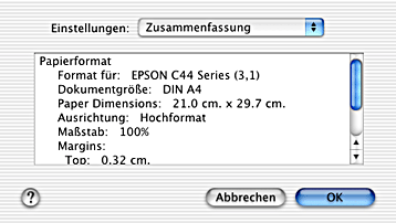 Wenn Zusammenfassung in der Liste Einstellungen gewählt ist, können Sie die aktuellen Einstellungen im Dialogfenster Seiteneinrichtung überprüfen.