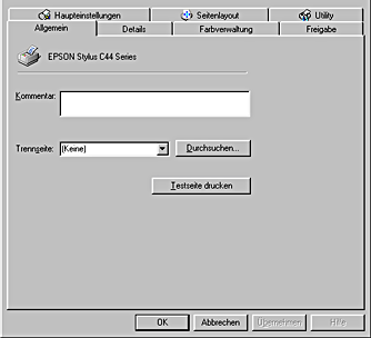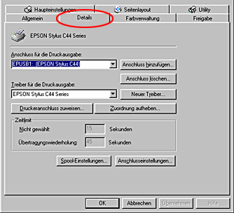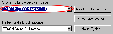 Wenn EPUSBx: (EPSON Stylus C44) im Listenfeld Anschluss für die Druckausgabe angezeigt wird, sind der USB-Druckertreiber und die Druckersoftware korrekt installiert. Wenn der korrekte Anschluss nicht angezeigt wird, fahren Sie mit dem nächsten Schritt fort.