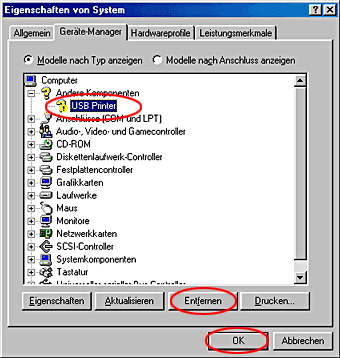Klicken Sie unter Andere Komponenten auf USB-Drucker oder EPSON Stylus C44 Series und klicken Sie dann auf Entfernen. Klicken Sie dann auf OK.