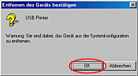 Wenn Sie die Plug-&-Play-Installation des Treibers unter Windows Me oder 98 abgebrochen haben, bevor der Vorgang beendet werden konnte, ist möglicherweise entweder der USB-Druckertreiber oder die allgemeine Druckersoftware nicht korrekt installiert. Beachten Sie die nachfolgend aufgeführten Anweisungen, um sicherzustellen, dass Treiber und Druckersoftware korrekt installiert sind.