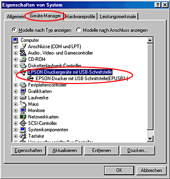 Wenn die Treiber korrekt installiert sind, erscheint die Option EPSON USB-Drucker auf der Registerkarte Geräte-Manager.