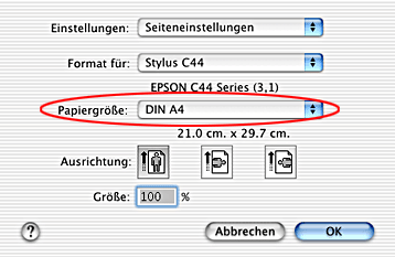 Wählen Sie das gewünschte Medium im Dialogfenster Drucken, während Druckereinstellungen gewählt ist, und wählen Sie dann das gewünschte Papiergröße im Dialogfenster Papierformat.