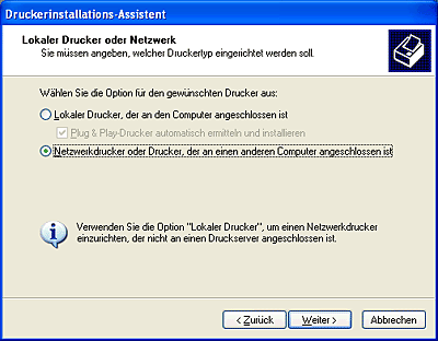 Wählen Sie Netzwerkdrucker oder Drucker, der an einen anderen Computer angeschlossen ist und klicken Sie dann auf Weiter.
