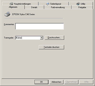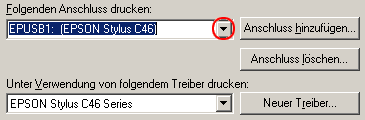 Wenn EPUSBX: (EPSON Stylus C46 Serie) in der Liste Anschluss für die Druckausgabe angezeigt wird, sind der USB-Druckertreiber und die Druckersoftware richtig installiert. Wenn der korrekte Anschluss nicht angezeigt wird, fahren Sie mit dem nächsten Schritt fort.
