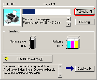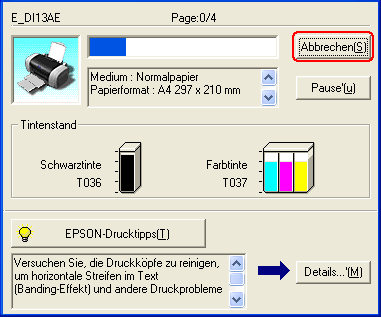 Mit Hilfe des Fortschrittsbalkens oder des EPSON Spool Managers ist es möglich, den laufenden Druckauftrag abzubrechen. Näheres finden Sie jeweils im entsprechenden Abschnitt weiter unten.
