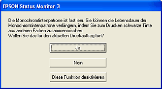 Wenn Sie auf die Schaltfläche Diese Funktion deaktivieren klicken, wird die schwarze Tinte ganz normal weiterhin verwendet. Dann wird das Dialogfeld für die restliche Nutzungsdauer der schwarzen Tintenpatrone nicht mehr angezeigt. In diesem Fall wird die schwarze Tinte normal verwendet, bis die Tintenpatrone leer ist.