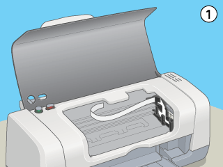 Drücken Sie die Wartungstaste . Der Druckkopf fährt in die Farb- bzw. Monochrom-Tintenpatronen-Auswechselposition, die Netzschalter-Kontrollleuchte blinkt und die Fehlerkontrollleuchte blinkt oder leuchtet. Wenn beide Tintenpatronen leer sind, fährt der Druckkopf zunächst in die Tintenpatronen-Auswechselposition für die Monochrom-Tintenpatrone. Betätigen Sie nach dem Austauschen der Monochrom-Tintenpatrone erneut die Wartungstaste , um zur Auswechselposition der Farbpatrone zu wechseln.