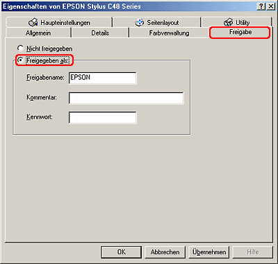 Klicken Sie auf Diesen Drucker freigeben und geben Sie einen Namen für den gemeinsam genutzten Drucker ein.