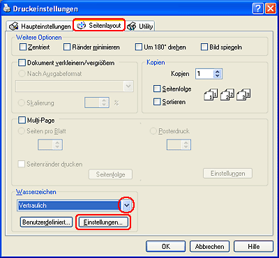 Mit der Funktion Wasserzeichen drucken können Sie ein textbasiertes oder ein bildbasiertes Wasserzeichen auf das Druckmedium drucken.