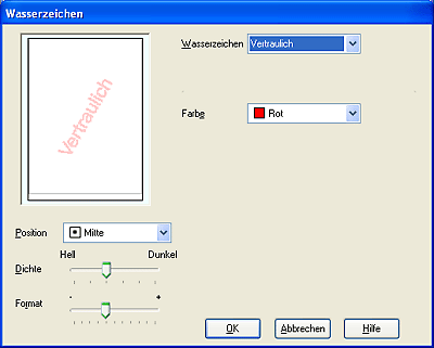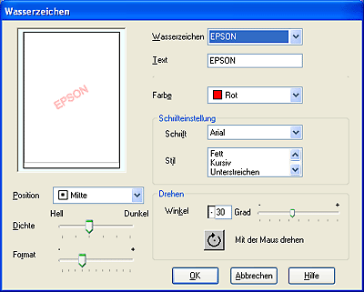![]() | Stellen Sie sicher, dass Sie das gewünschte Wasserzeichen in der Liste Wasserzeichen ausgewählt haben, und führen Sie dann die Einstellungen für Farbe, Position, Dichte, Größe, Schriftart, Schriftstil und Winkel durch. (Nähere Informationen finden Sie in der Online-Hilfe.) Die von Ihnen gewählten Einstellungen werden links im Dialogfeld angezeigt. |