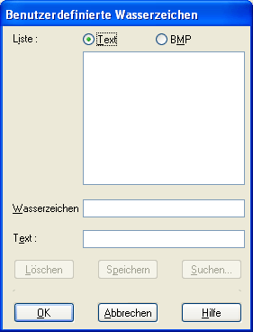 ![]() | Um eine Bilddatei als Wasserzeichen zu verwenden, klicken Sie auf die Schaltfläche BMP. Klicken Sie auf Durchsuchen, um die Bitmap-Datei auszuwählen, und anschließend auf OK. Geben Sie im Textfeld Name einen Namen für das Wasserzeichen ein und klicken Sie anschließend auf Speichern. |