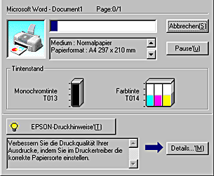 Sie können den Füllstand der Tintenpatronen entweder mit dem EPSON Status Monitor oder dem Fortschrittsbalken prüfen. Näheres finden Sie jeweils im entsprechenden Abschnitt weiter unten.