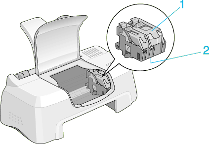 1. Arretierbügel der Tintenpatronen: Hält die Tintenpatronen an ihrem Platz. Öffnen Sie die Arretierbügel nur, wenn Sie Tintenpatronen einbauen oder austauschen.
