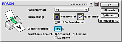 Im Dialogfenster Papierformat können Sie das Papierformat ändern, die Papierausrichtung festlegen, die Vorlage um 180 Grad drehen, den skalierten Ausdruck festlegen und den Druckbereich einstellen.