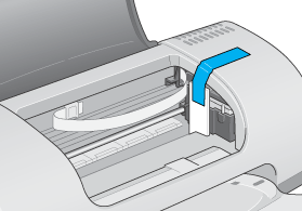 ![]() | Öffnen Sie erneut die Druckerabdeckung. Befestigen Sie die Patronenhalterung mit Schutzklebeband am Drucker, wie unten gezeigt, und schließen Sie die Druckerabdeckung. |