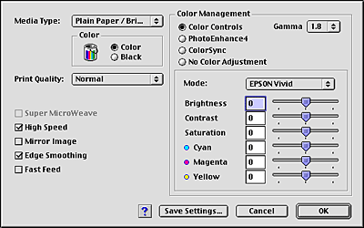 For use with the color matching and image enhancement methods provided by the printer driver. When you select Color Controls, additional settings appear under Color Management, allowing you to select a Mode setting and to adjust the color enhancement sliders.