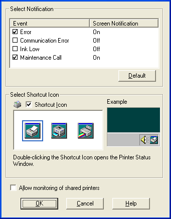 Select the Shortcut Icon check box and choose an icon type to have a shortcut icon placed in your Windows taskbar. You can click the shortcut icon in the taskbar to open EPSON Status Monitor 3 or right-click the icon to access some of the printer utilities. |