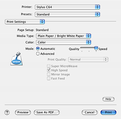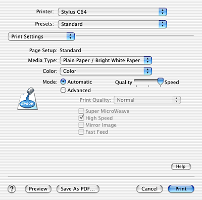 Provides the quickest and easiest way to start printing. The printer software takes care of all detailed settings based on the current Media Type and Color settings.