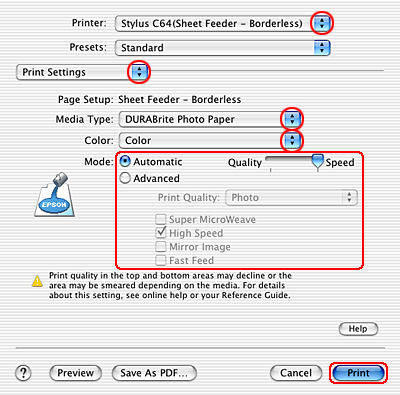 Select Stylus C64 (Sheet Feeder - Borderless) as the Print setting, then make the Copies & Pages settings.