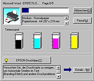 Sie können den Füllstand der Tintenpatronen entweder mit dem EPSON-Statusmonitor3 oder dem Fortschrittsbalken prüfen. Näheres finden Sie jeweils im entsprechenden Abschnitt weiter unten.