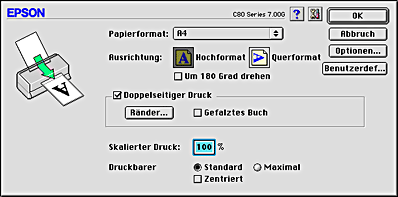 Der EPSON Stylus C80/C70 unterstützt doppelseitigen Druck. Es gibt zwei Arten, doppelseitig zu drucken. Die Standardform des doppelseitigen Drucks ermöglicht Ihnen, die ungeraden Seiten zuerst zu drucken. Wenn diese Seiten gedruckt sind, können sie erneut eingelegt werden, um die geraden Seiten auf der anderen Papierseite zu drucken. Mit der Einstellung Broschüre können Sie durch mittiges Falten des Dokuments eine Broschüre erzeugen. Näheres finden Sie jeweils im entsprechenden Abschnitt weiter unten.