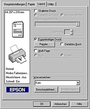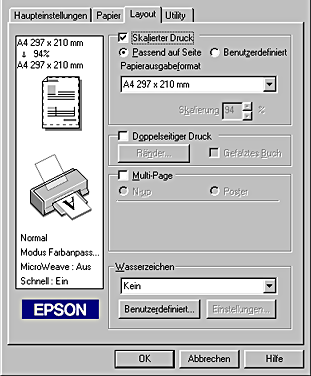Auf der Registerkarte Layout können Sie die Einstellungen Skalierter Druck, Multi-Page und Wasserzeichen vornehmen. Näheres finden Sie jeweils im entsprechenden Abschnitt weiter unten.