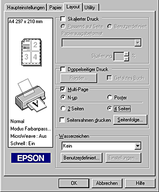 Wählen Sie N-up als Einstellung Multi-Page in der Registerkarte Layout, um zwei bzw. vier Seiten Ihres Dokuments auf ein Einzelblatt zu drucken.