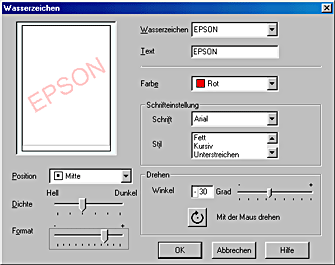 Stellen Sie sicher, dass Sie das gewünschte Wasserzeichen im Listenfeld Wasserzeichen ausgewählt haben, für das Sie Farbe, Position, Dichte, Größe, Schriftart, Zeichenformat und Winkel einstellen möchten. (Nähere Informationen finden Sie in der Online-Hilfe.) Die von Ihnen gewählten Einstellungen werden links im Dialogfeld angezeigt.