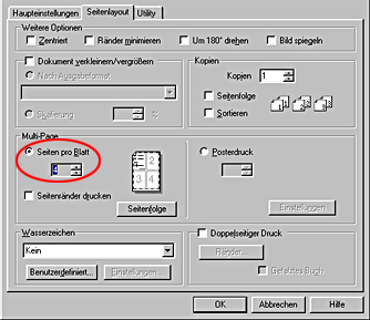Druckt mehrere Seiten des Dokuments auf ein Einzelblatt. Sie können 1, 2, 4, 6, 9 oder 16 Seiten wählen. |