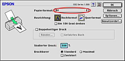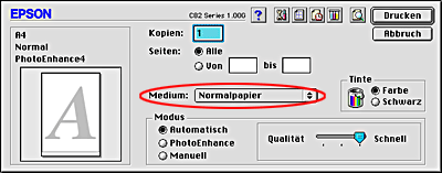 Auf dem Macintosh wählen Sie im Dialogfenster Drucken den gewünschten Medium. Wählen Sie dann im Dialogfenster Papierformat das gewünschte Papierformat.