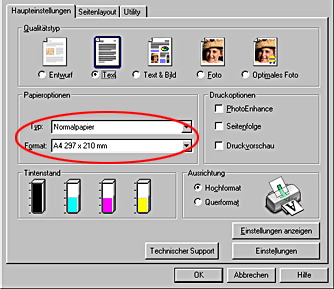 Unter Windows wählen Sie auf der Registerkarte Haupteinstellungen unter Papieroptionen die gewünschten Einstellungen für Format und Typ.