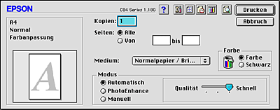 Wenn Automatisch gewählt ist, werden alle weiteren Einstellungen auf der Basis der aktuellen Einstellungen für Medium und Farbe von der Druckersoftware vorgenommen.