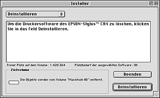 Ziehen Sie den Ordner Referenzhandbuch, der sich im Ordner EPSON Stylus C84 befindet, von der Festplatte auf das Symbol Papierkorb. Ziehen Sie dann das Symbol ESC84 Referenzhandbuch vom Schreibtisch in den Papierkorb.