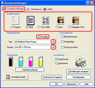 Nachdem Sie die Medien eingelegt haben, ändern Sie die Einstellungen im Druckertreiber zu Drucken ohne Ränder.