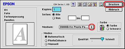 Nehmen Sie die erforderlichen Einstellungen für Medium, Farbe und Modus vor.