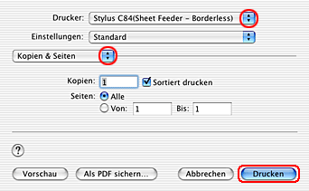 Wählen Sie Stylus C84 (Sheet Feeder - Borderless) als Einstellung für Drucken aus und nehmen Sie dann die Einstellungen für Kopien & Seiten vor.