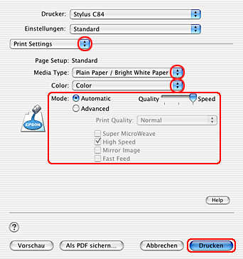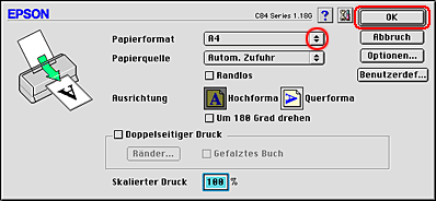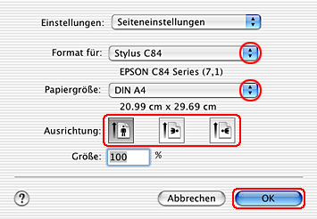 ![]() | Wählen Sie Stylus C84 als Einstellung für Format aus. |