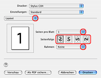 Hier können Sie die Reihenfolge festlegen, in der die Seiten auf das Einzelblatt gedruckt werden. |
