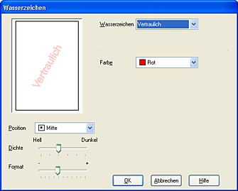 Stellen Sie sicher, dass Sie das gewünschte Wasserzeichen in der Liste Wasserzeichen ausgewählt haben, und führen Sie dann die Einstellungen für Farbe, Position, Dichte, Größe, Schriftart, Schriftstil und Winkel durch. (Nähere Informationen finden Sie in der Online-Hilfe.) Die von Ihnen gewählten Einstellungen werden links im Dialogfeld angezeigt.