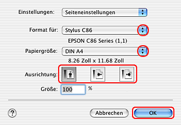 Nehmen Sie die erforderlichen Einstellungen für Format für vor. Wählen Sie Stylus C86 zum Drucken mit Standardrändern aus.
