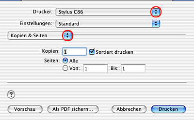 Nehmen Sie die Einstellung für Drucker entsprechend der Einstellung für Format für vor, die Sie in Schritt 3 im Dialogfeld Papierformat vorgenommen haben. Nehmen Sie dann die Einstellungen für Kopien & Seiten vor.