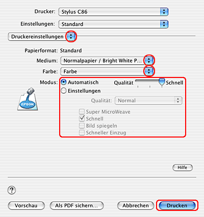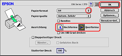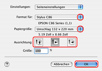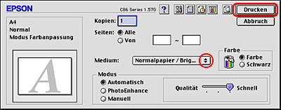 ![]() | Wählen Sie Stylus C86 als Einstellung für Format aus. |