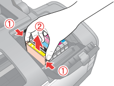 Öffnen Sie die Tintenpatronenabdeckung. Drücken Sie am Hebel hinten an der Patrone, die Sie ersetzen möchten. Nehmen Sie die Patrone gerade nach oben aus dem Drucker und entsorgen Sie sie ordnungsgemäß. Nehmen Sie die gebrauchte Patrone nicht auseinander und versuchen Sie nicht, sie wieder zu befüllen.