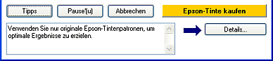 In einem Textfeld unten im Dialogfeld des Fortschrittsbalkens erscheinen Tipps, wie Sie den Epson-Druckertreiber optimal einsetzen können. Alle 30 Sekunden erscheint ein neuer Tipp. Wenn Sie mehr Informationen zum angezeigten Tipp wünschen, klicken Sie auf die Schaltfläche Details.