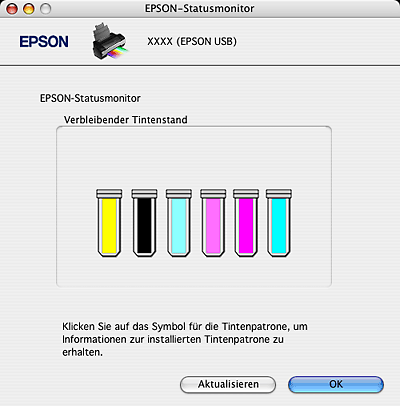 Sie können dieses Utility auch verwenden, um den Tintenpatronenstatus vor dem Drucken zu überprüfen. EPSON StatusMonitor zeigt den Tintenpatronenstatus zum Zeitpunkt des Öffnens an. Um den Status der Tintenpatronen zu aktualisieren, klicken Sie auf Aktualisieren.