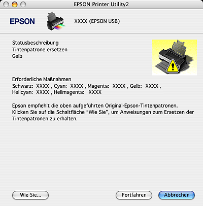 Wenn eine Tintenpatrone fast leer oder verbraucht ist, erscheint die Schaltfläche Wie Sie.... Wenn Sie auf Wie Sie... klicken, zeigt EPSON Statusmonitor Schritt-für-Schritt-Anweisungen zum Austauschen der Tintenpatrone an.