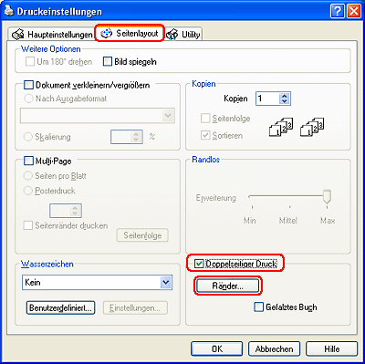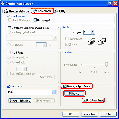 Der tatsächliche Bindungsrand kann abhängig von der Anwendung von den vorgegebenen Einstellungen abweichen. Drucken Sie einige Testseiten aus, bevor Sie den gesamten Druckauftrag starten.