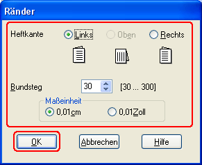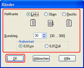Wählen Sie cm oder Zoll als Einstellung für Maßeinheit aus. Legen Sie die Breite des Bindungsrands fest.
