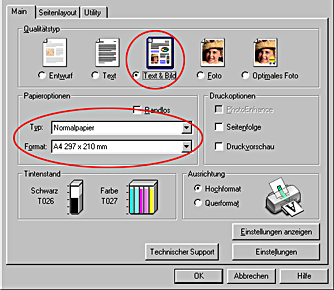 ![]() | Klicken Sie auf die Registerkarte Haupteinstellungen und wählen Sie unter Papieroptionen die Einstellungen Normalpapier und A4 sowie unter Qualitätstyp die Einstellung Text & Bild. |