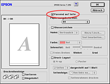 Markieren Sie das Kontrollkästchen Passend auf Seite im Dialogfenster Layout (Macintosh).